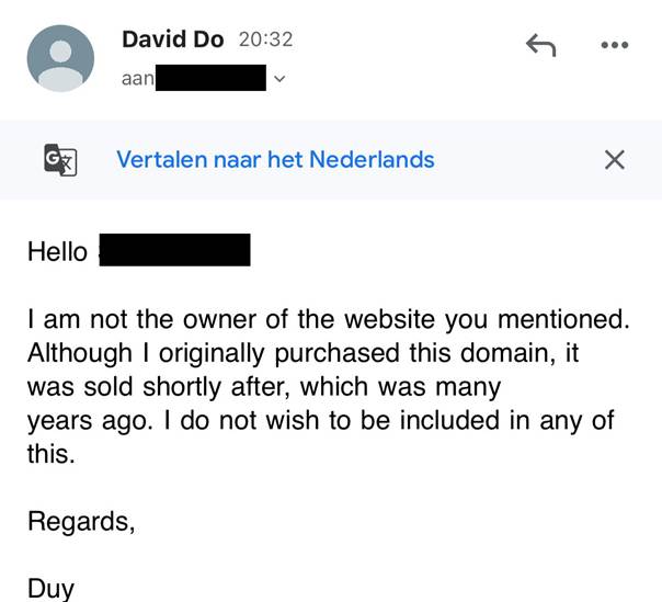 Using our OSINT tools, we identified a direct link between the username AznRico and the private email address duydaviddo@hotmail.com. Based on this evidence, we asked our collaborating journalist at Algemeen Dagblad to contact him via his private email. When confronted, David claimed that he had purchased the domain but had since sold it.